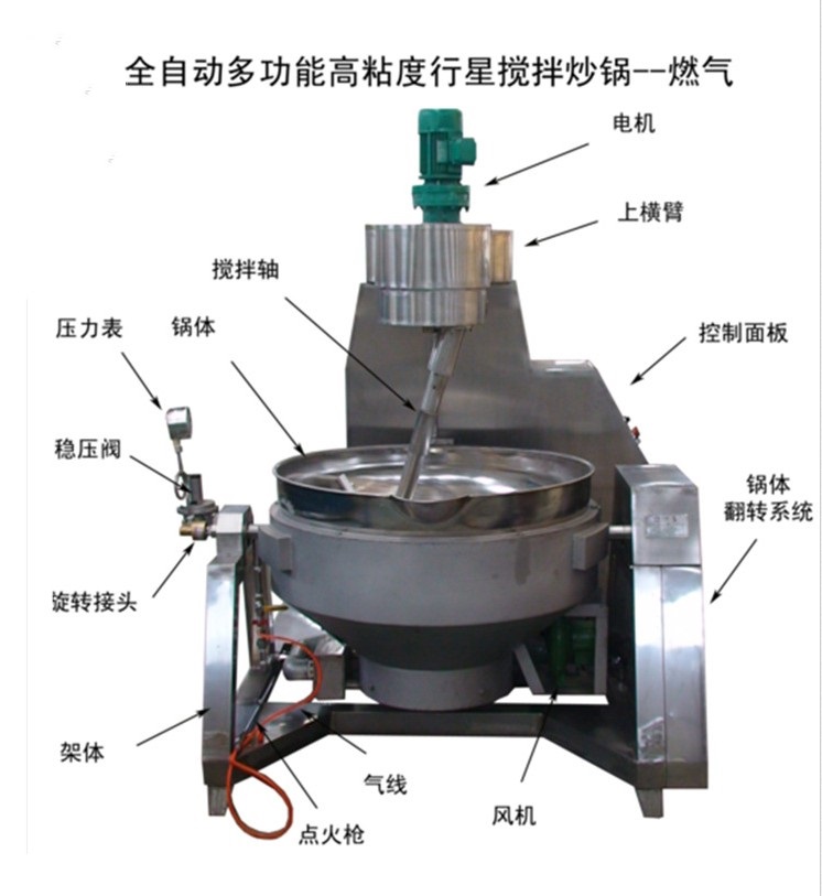行星搅拌燃气炒锅广泛适用于莲蓉、水果蓉、豆馅、枣泥、酱料、阿胶、咖喱调理食品以及日用化工、制药等行业的搅拌混合。