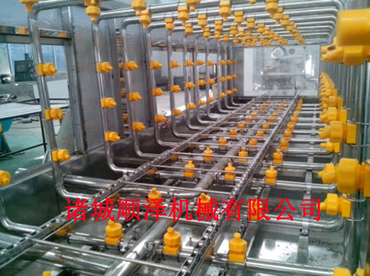2. 设备有热碱水喷淋段、热水喷淋段、清水喷淋段、消毒水喷淋段、烘干段等几部分组成,其中消毒水喷淋段及烘干段可根据客户要求定配。
