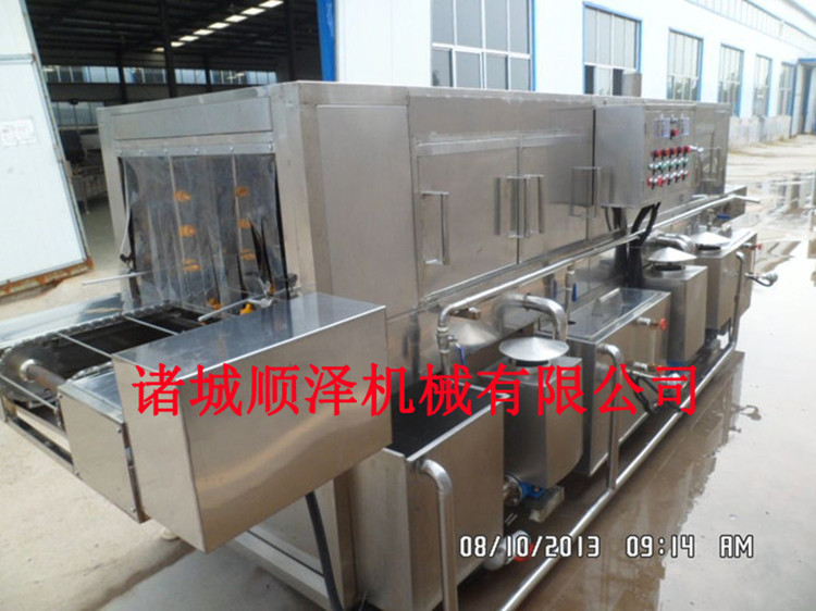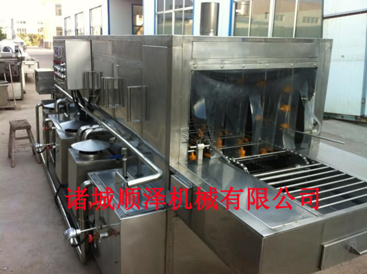 清洗分为三段*一段为热碱水,第二段为热清水,第三段为自来水。三段喷淋水除第三段自来水外都有独立循环过滤水箱,第三段自来水作为补充水回收至第二段水箱加热使用过后部分污水被自动排出。第二水箱内设有蒸汽加热管,温度从常温至100°C自由设定、自动恒温。