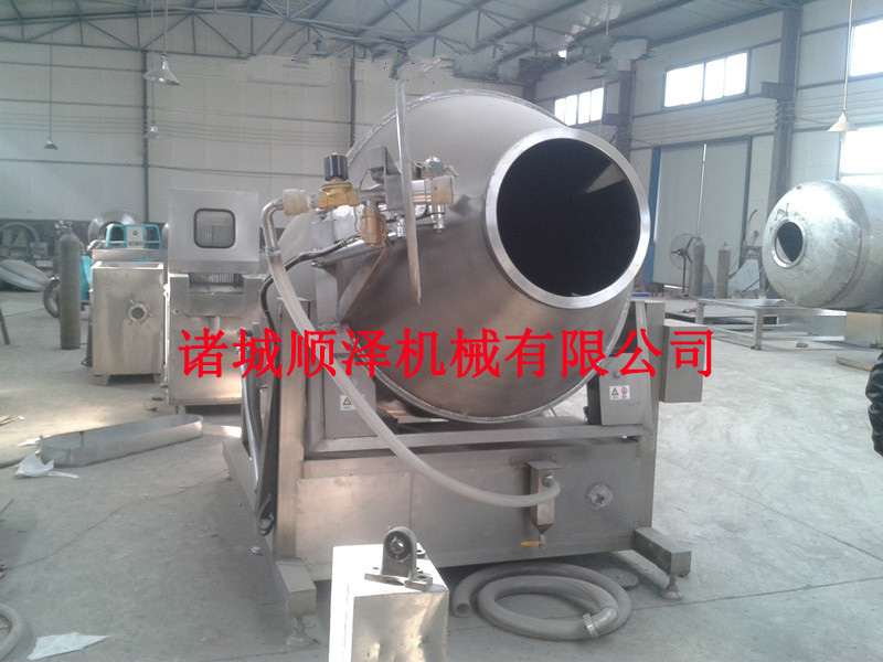 真空滚揉机是在真空状态下,利用物理冲击的原理,让肉在滚筒内上下翻动,相互撞击、摔打,达到按摩、腌渍的作用,使肉均匀的吸收腌渍,提高肉的结着力及产品的弹性;本机具有肺呼吸功能,让产品在滚筒内做膨胀、缩小的往复运动,改善了肉组织的结构,提高了切面效果,增加了出品率。可以增强保水性,改善产品的内部结构。
